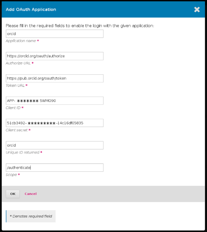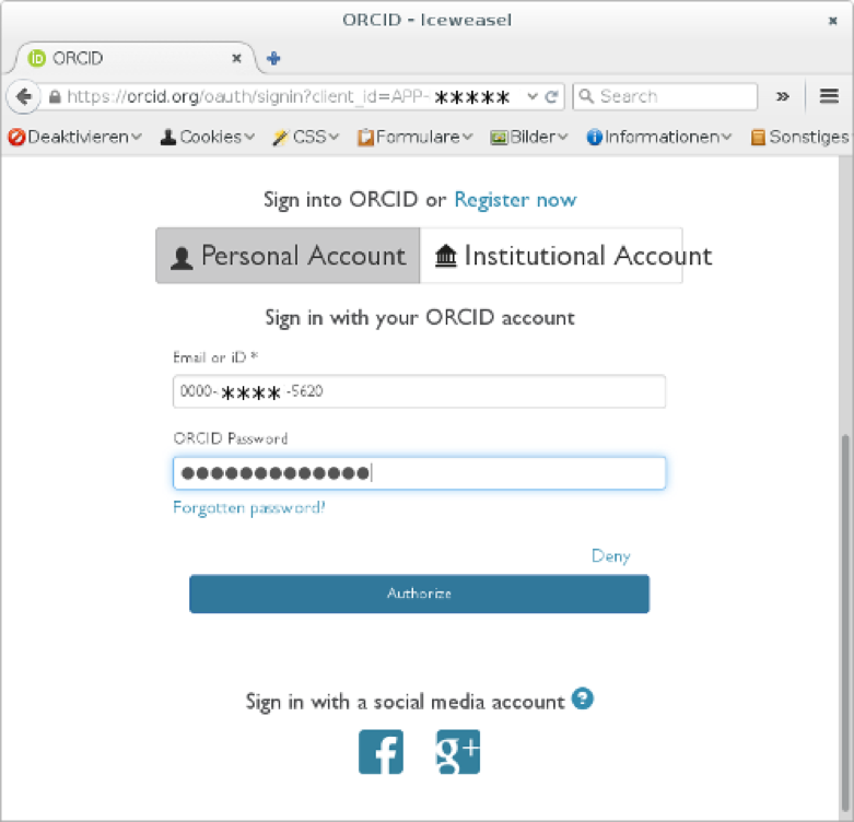 For the authentication with ORCID, the ORCID public API is used. Access to the ORCID API requires a set of credentials consisting of a Client ID and a Client Secret. Thus, first the journal needs to register for the API credentials, c.f. http://support.orcid.org/knowledgebase/articles/343182. Once the credentials are obtained, they should be entered in the plugin settings. In the same way the other applications with their credentials can be added, for the moment however we worked only with ORCID.
