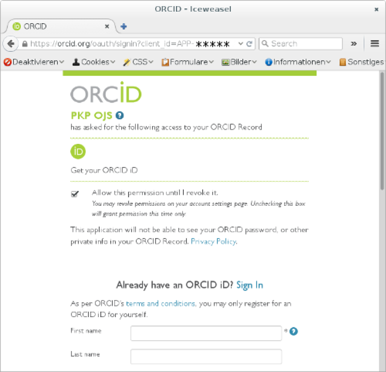 When using the ORCID account to log in, the user will first be redirected to the ORCID site, where he/she can sign in. If the ORCID authorization is successful, the user will be logged in in OJS and redirected to his/her OJS dashboard page.