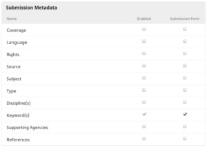 Users within OJS 3.x are able to enable and disable metadata fields in OJS 3.0.2, so they can be either presented or hidden from the metadata form during submission (for the author) and later during the editing process (for authors, editors, etc). Setting up these fields looks like this: