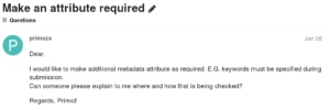 This is useful for controlling whether or not metadata fields are available, but users on our support forum also wanted to be able to control whether metadata fields are required, i.e. controlling which fields the submission system would force authors to complete before accepting the submission. Here’s one such request: