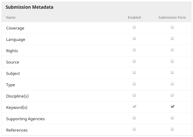 Users within OJS 3.x are able to enable and disable metadata fields in OJS 3.0.2, so they can be either presented or hidden from the metadata form during submission (for the author) and later during the editing process (for authors, editors, etc). Setting up these fields looks like this: