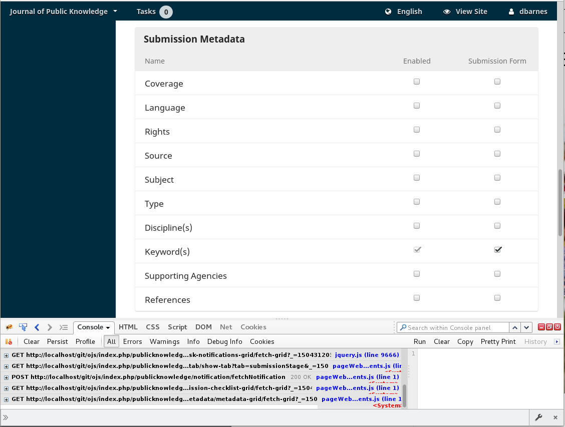 One good way to start is by looking at request URLs and using them to identify handling code. OJS 3.x uses subrequests to build a page, so a developer toolset in a browser is useful. We’ll use Firebug’s developer tools; other browsers will be similar. Enabling the tool and browsing to the settings area we wish to extend results in the following: