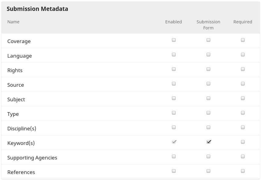 This is useful for controlling whether or not metadata fields are available, but users on our support forum also wanted to be able to control whether metadata fields are required, i.e. controlling which fields the submission system would force authors to complete before accepting the submission. Here’s one such request: