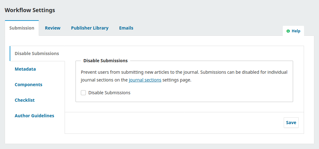 Journal Managers and Editors can now configure the Workflow Settings to disable all submissions for a journal. This can be used by journals that are no longer publishing new content.