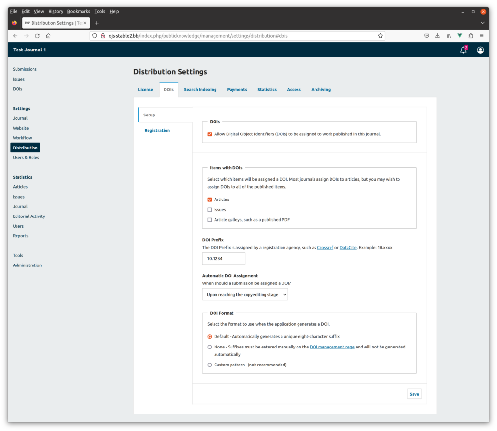Under ‘Setup’, one can choose which types of publication items should be assigned a DOI, add a prefix, choose if the DOIs should be assigned automatically, and choose the format to use when DOIs are generated.