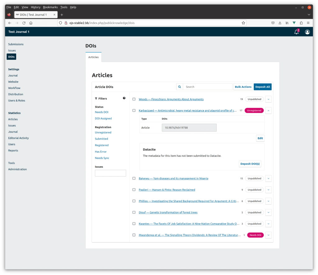 The DOIs are deposited in several ways: either automatically upon publication, using the button ‘Deposit All’, selecting some items and using the bulk action ‘Deposit DOIs’, or expanding an item and depositing it.