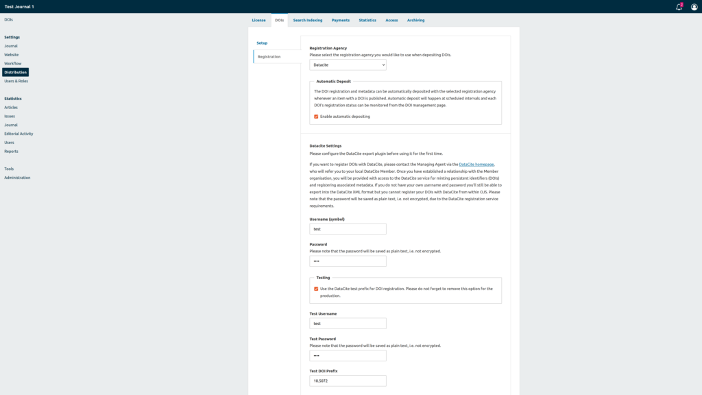 Users can enable the automatic registration upon DOI publication and enter their DataCite Repository account username and password needed for the DOI registration. Users can also select to use the DataCite test system, then enter the test username, password, and prefix.