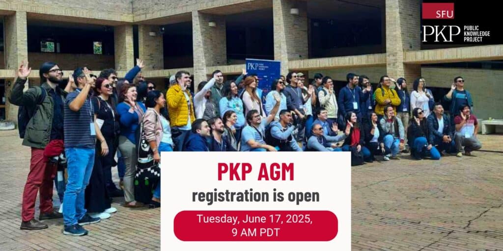 Registration is now open for the PKP 2025 AGM! Discover the latest in open scholarly publishing, connect with the community, and shape the future of open access. Please join us on Tuesday, June 17th, 2025, at 9 AM PDT.