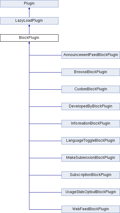 Reimplemented in CustomBlockPlugin, UsageStatsOptoutBlockPlugin, WebFeedBlockPlugin, AnnouncementFeedBlockPlugin, LanguageToggleBlockPlugin, SubscriptionBlockPlugin, InformationBlockPlugin, MakeSubmissionBlockPlugin, and BrowseBlockPlugin.