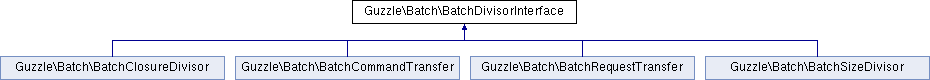 Implemented in Guzzle\Batch\BatchSizeDivisor, Guzzle\Batch\BatchClosureDivisor, Guzzle\Batch\BatchRequestTransfer, and Guzzle\Batch\BatchCommandTransfer.