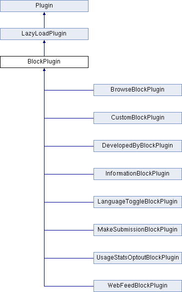 Reimplemented in CustomBlockPlugin, BrowseBlockPlugin, UsageStatsOptoutBlockPlugin, LanguageToggleBlockPlugin, InformationBlockPlugin, and MakeSubmissionBlockPlugin.