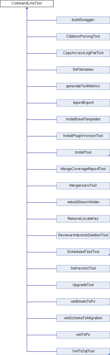 Reimplemented in CopyAccessLogFileTool, XmlToSqlTool, MergeCoverageReportTool, xmlToPo, ScheduledTaskTool, RemoveLocaleKey, xmlSchemaToMigration, xmlEmailsToPo, UpgradeTool, installEmailTemplates, MergeUsersTool, fixFilenames, InstallPluginVersionTool, generateTestMetrics, InstallTool, importExport, CitationsParsingTool, ReviewerInterestsDeletionTool, buildSwagger, and rebuildSearchIndex.