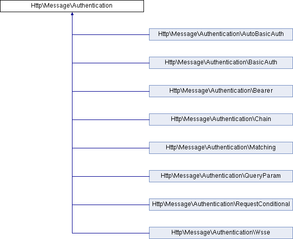 Implemented in Http\Message\Authentication\Matching, Http\Message\Authentication\RequestConditional, Http\Message\Authentication\BasicAuth, Http\Message\Authentication\Wsse, Http\Message\Authentication\Chain, Http\Message\Authentication\QueryParam, Http\Message\Authentication\AutoBasicAuth, and Http\Message\Authentication\Bearer.