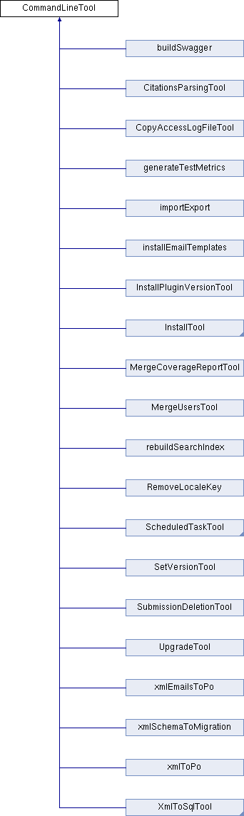 Reimplemented in CopyAccessLogFileTool, XmlToSqlTool, MergeCoverageReportTool, xmlToPo, ScheduledTaskTool, RemoveLocaleKey, xmlSchemaToMigration, xmlEmailsToPo, UpgradeTool, installEmailTemplates, MergeUsersTool, InstallPluginVersionTool, generateTestMetrics, InstallTool, SubmissionDeletionTool, CitationsParsingTool, importExport, buildSwagger, and rebuildSearchIndex.