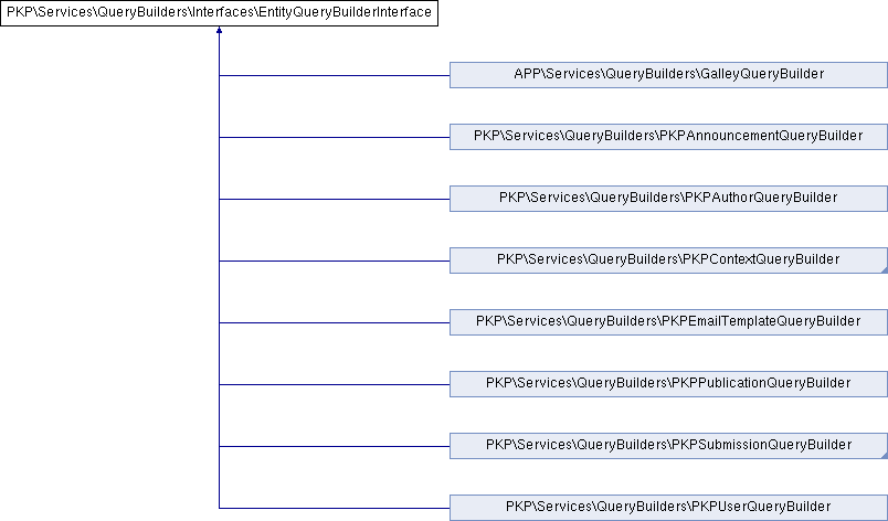 Implemented in PKP\Services\QueryBuilders\PKPUserQueryBuilder, PKP\Services\QueryBuilders\PKPSubmissionQueryBuilder, PKP\Services\QueryBuilders\PKPEmailTemplateQueryBuilder, PKP\Services\QueryBuilders\PKPAuthorQueryBuilder, PKP\Services\QueryBuilders\PKPContextQueryBuilder, PKP\Services\QueryBuilders\PKPPublicationQueryBuilder, PKP\Services\QueryBuilders\PKPAnnouncementQueryBuilder, and APP\Services\QueryBuilders\GalleyQueryBuilder.