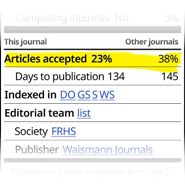 This is the percentage of articles selected for publication by the editors from among those submitted to the journal, following peer review and the authors’ revisions.