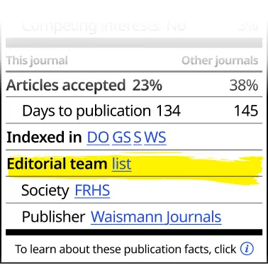 Editors, board members, authors, and reviewers are asked to verify their identities with the scholarly publishing organization ORCID, which also enables you to see their profiles by clicking on the green ORCID icon after their name.