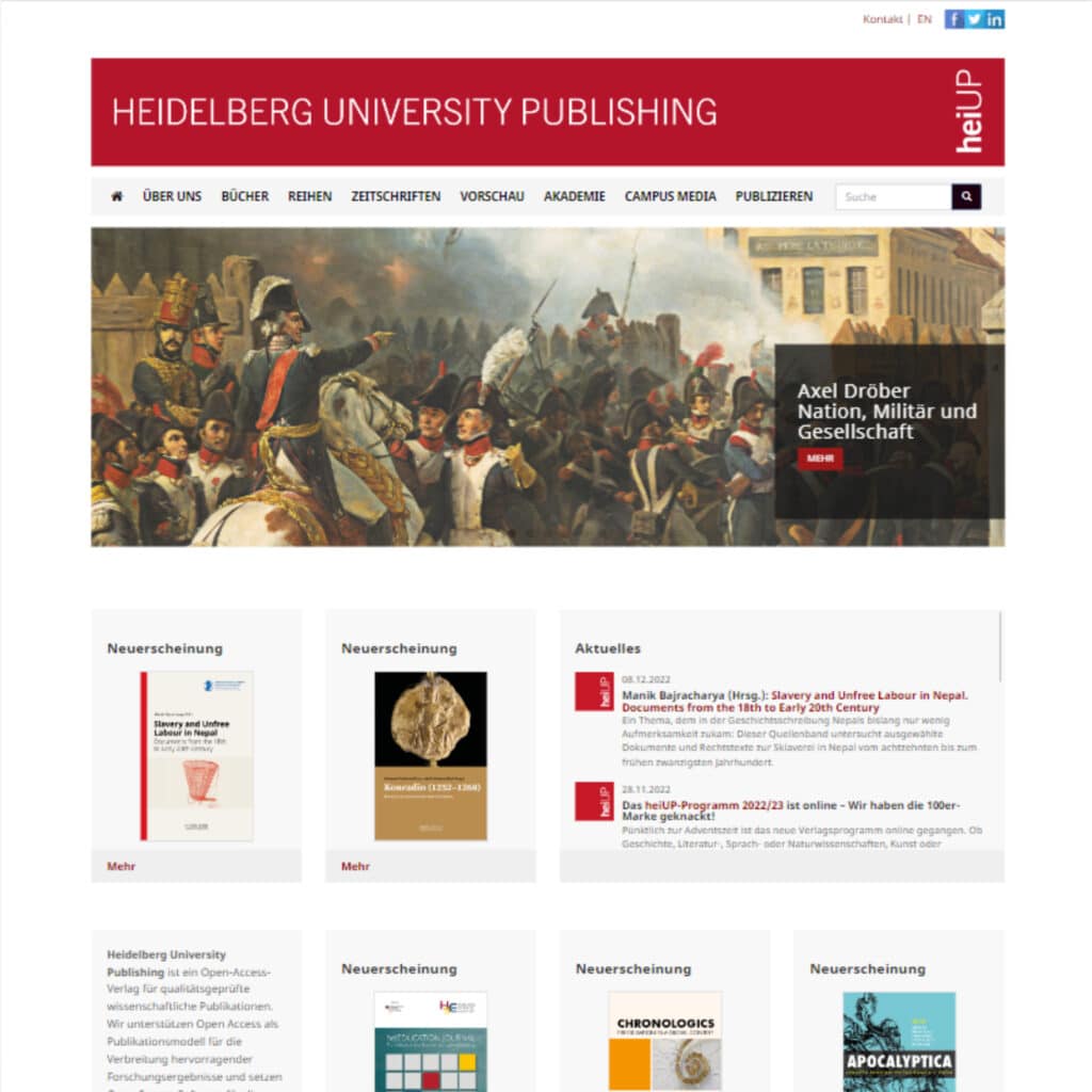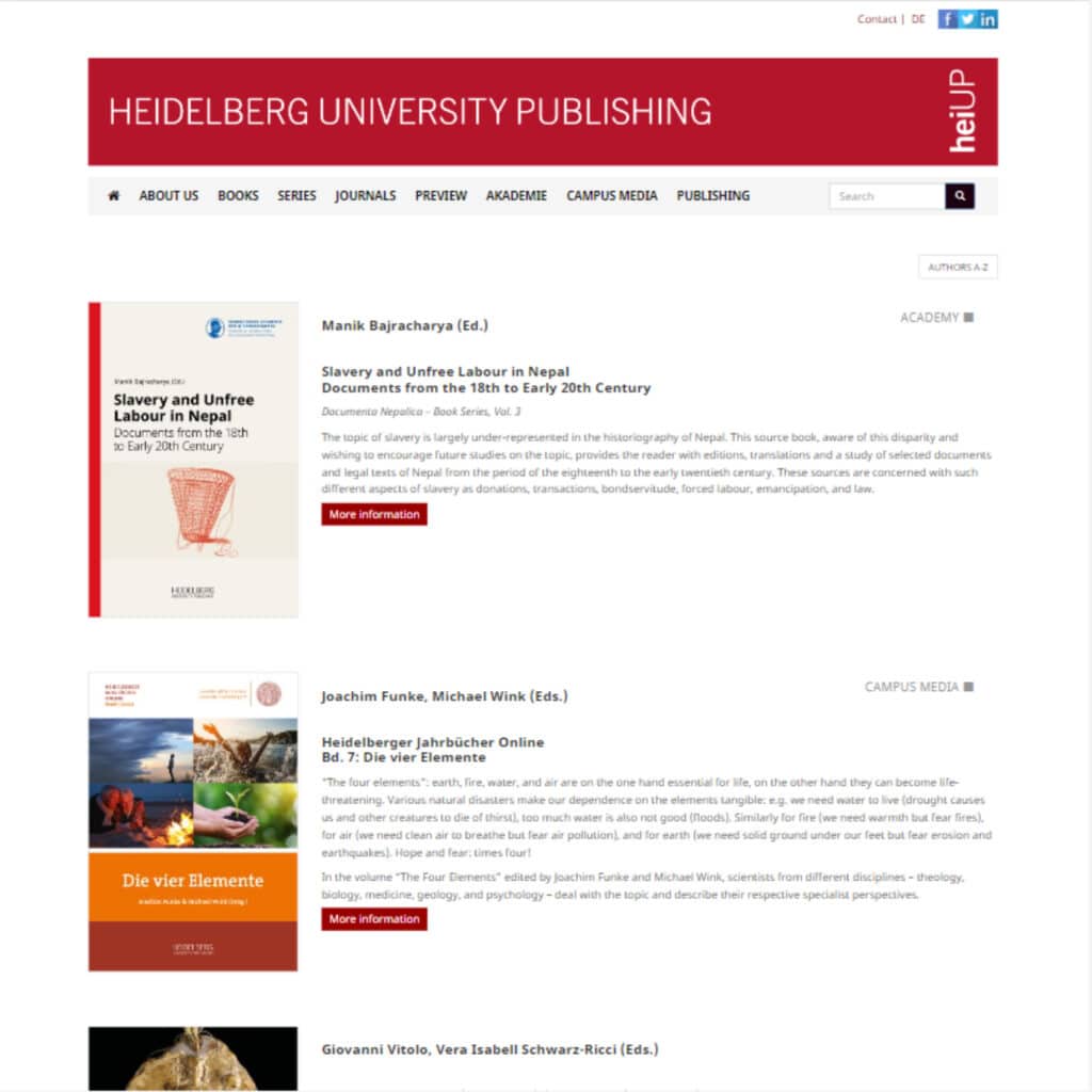 Their bookshops include Heidelberg University’s academic publishing house Heidelberg University Publishing (heiUP), heiBOOKS (a service specifically for Heidelberg academics), and the publication platforms for three specialist information services, namely Art – Photography – Design, Ancient History (Propylaeum) and South Asia (FID4SA).